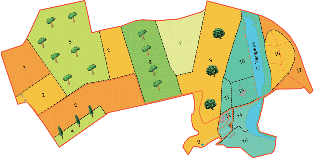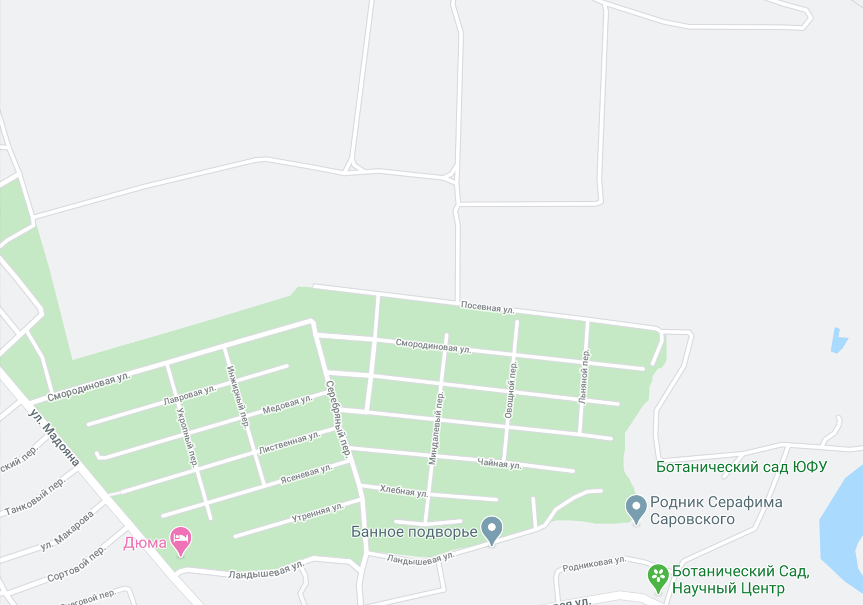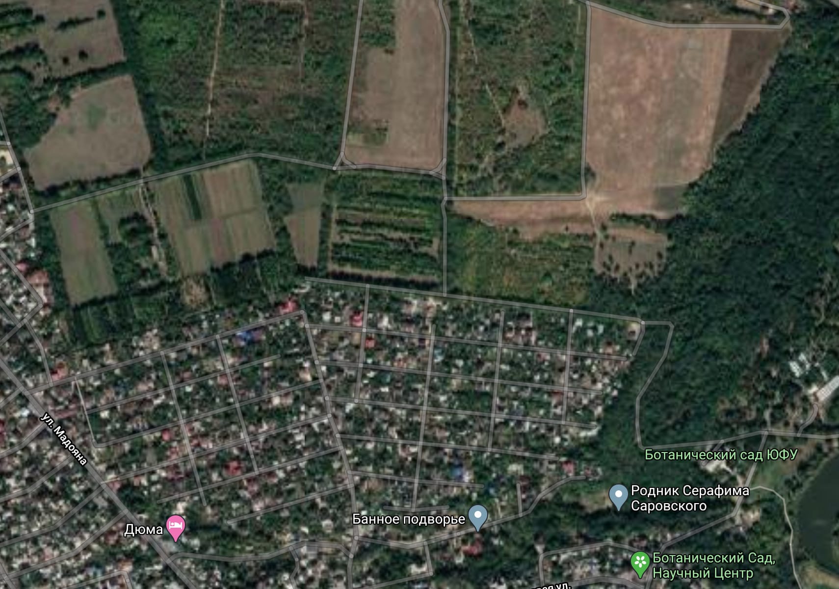 Даже забора нет. Растут кусты, между ними утоптанная тропинка, ведущая прямо в Ботанический сад Южного Федерального университета. У него есть закрытые территории, но большей частью он всегда открыт. Вот его схема с официального сайта: